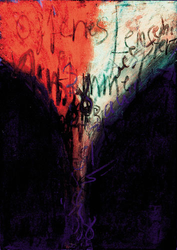 Die Ausstellung zeigte außerdem eine Auswahl von Gemälden, die wiederum von Schrift dominiert waren und teilweise erst im Dunkeln bei Schwarzlicht ihre Botschaft erkennen ließen.